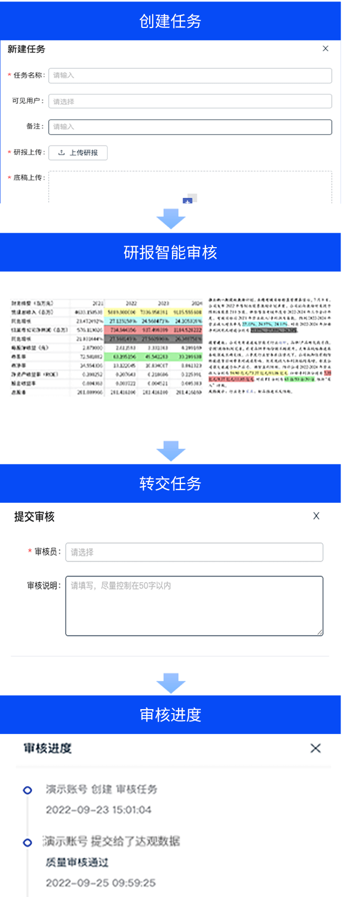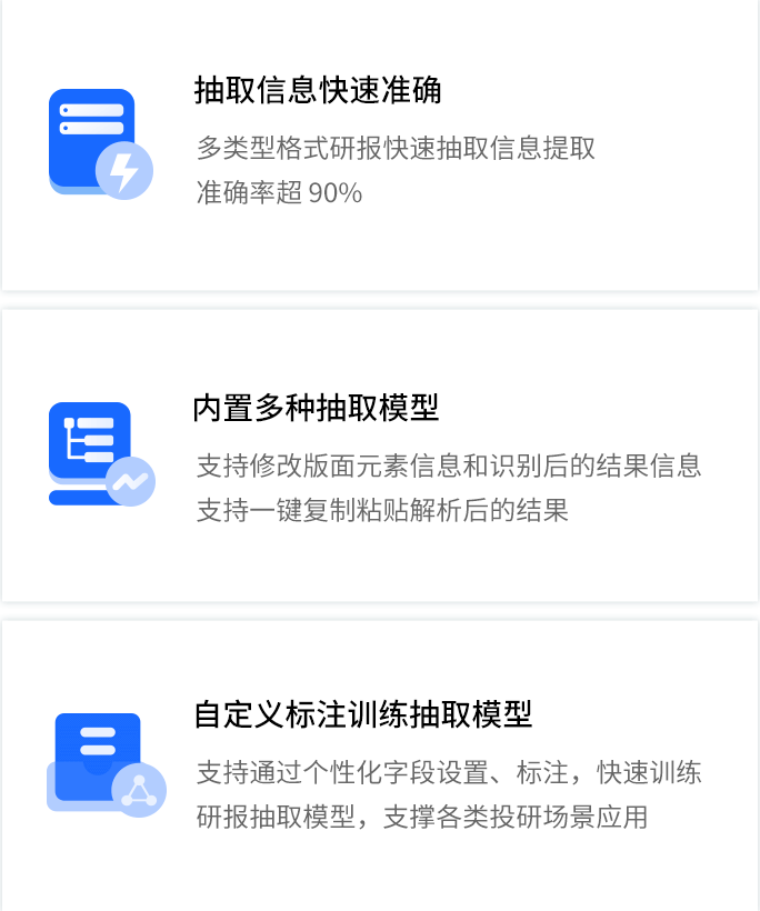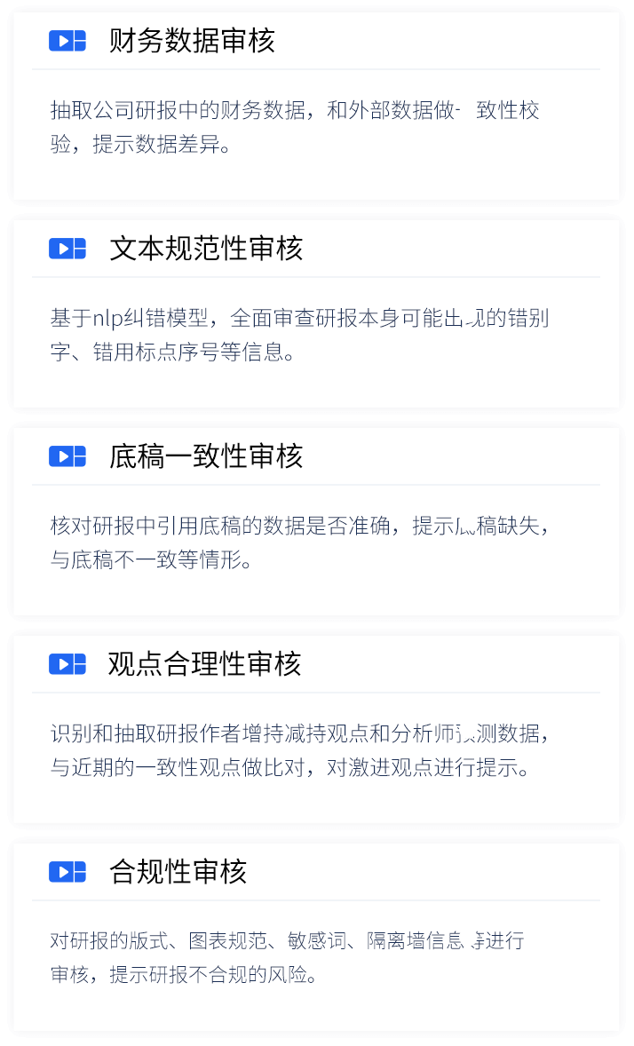 智能研报审核系统是918博天娱乐官网数据为券商研究所、买方研究组织等用户打造的集研报解析、抽取、审核、管理功能为一体的产品。集成OCR、NLP、机器学习等技术,对研报和底稿信息进行多方面抽取,并对研报进行数据、文本、观点等全方位的自动化审核, 同时对研报和底稿进行规范化、流程化管理,帮助用户提升工作效率,把控研报发布的时效性和合规性,全面降低出错风险。
